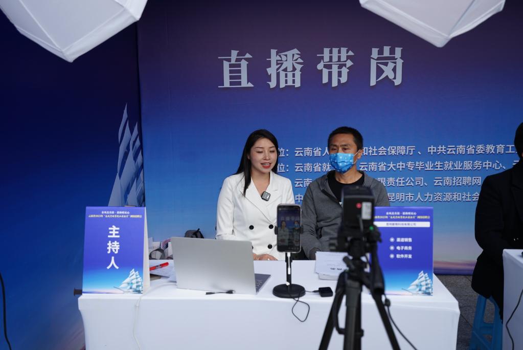 3月3日,在云南省2023年“春风行动暨就业援助月”专场招聘活动现场,工作人员“直播带岗”。新华社记者佟璐 摄