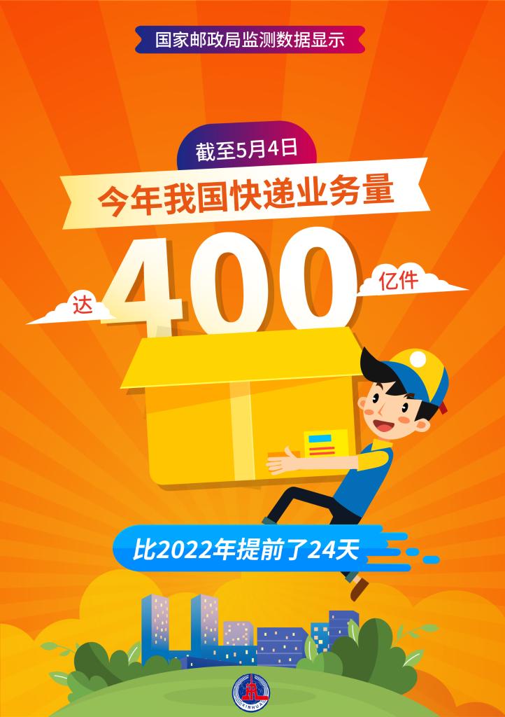 新华社北京5月5日电(记者戴小河)国家邮政局监测数据显示,截至5月4日,今年我国快递业务量达400亿件,比2022年提前了24天。