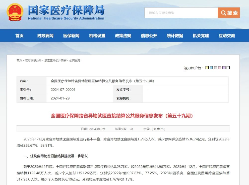 国家医保局:2023年跨省异地就医直接结算1.29亿人次
