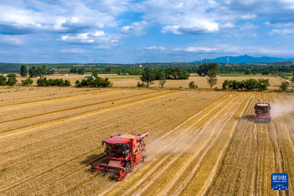 6月5日,收割机在河南三门峡灵宝市的麦田里收获小麦。新华社发(杜杰 摄)