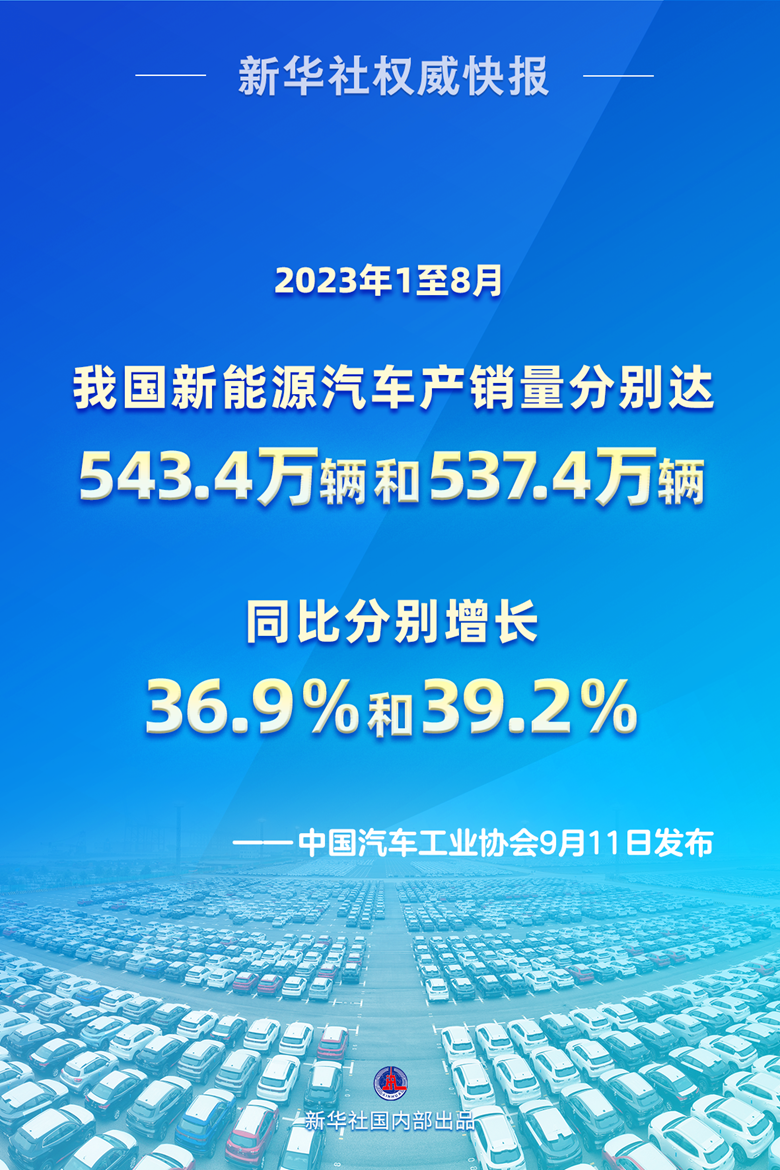 中汽协发布数据显示,1至8月,新能源汽车产销量分别达543.4万辆和537.4万辆,同比分别增长36.9%和39.2%,市场占有率达29.5%。