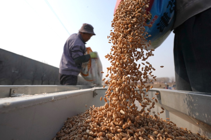 2月16日,河北省唐山市芦台经济开发区海北镇小海北村农民将备好的小麦种子、肥料一起放进播种机。新华社发(董军摄)