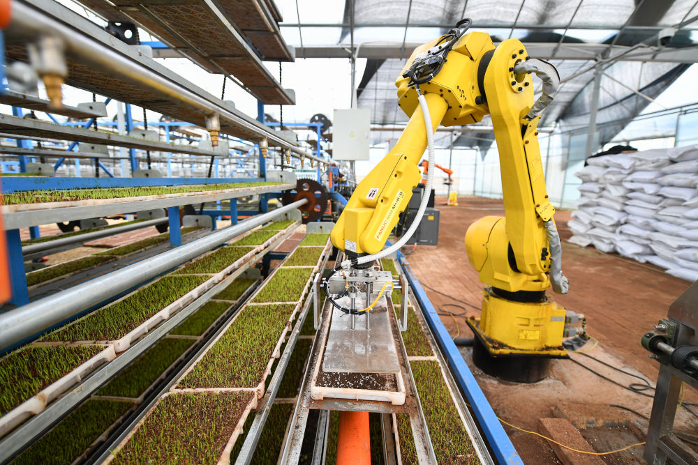 2024年3月22日,在湖南省湘潭市雨湖区姜畲镇青亭村,智能机器人将水稻秧盘搬运到循环式智能育秧机上。
