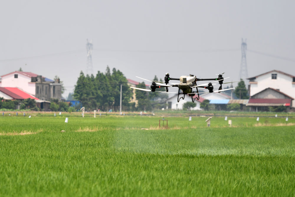2024年6月6日,植保无人机在湖南省益阳市大通湖区再生稻无人农场作业。