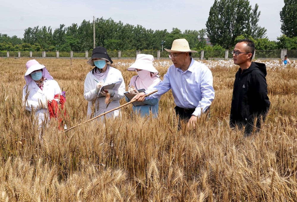 2021年5月26日,在河南省邓州国家杂交小麦项目产业化基地试验田里,北京市农林科学院研究员赵昌平(右二)带领研究团队进行种质资源田间评价。邓州国家杂交小麦项目产业化基地是全国首个杂交小麦全产业链基地,集杂交小麦种质创新、品种选育、亲本繁育、杂交制种、示范推广等功能为一体。