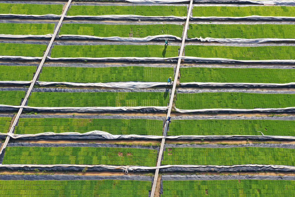 2024年3月28日,江西省南昌市南昌县蒋巷镇大田农社农民在给秧苗补水(无人机照片)。