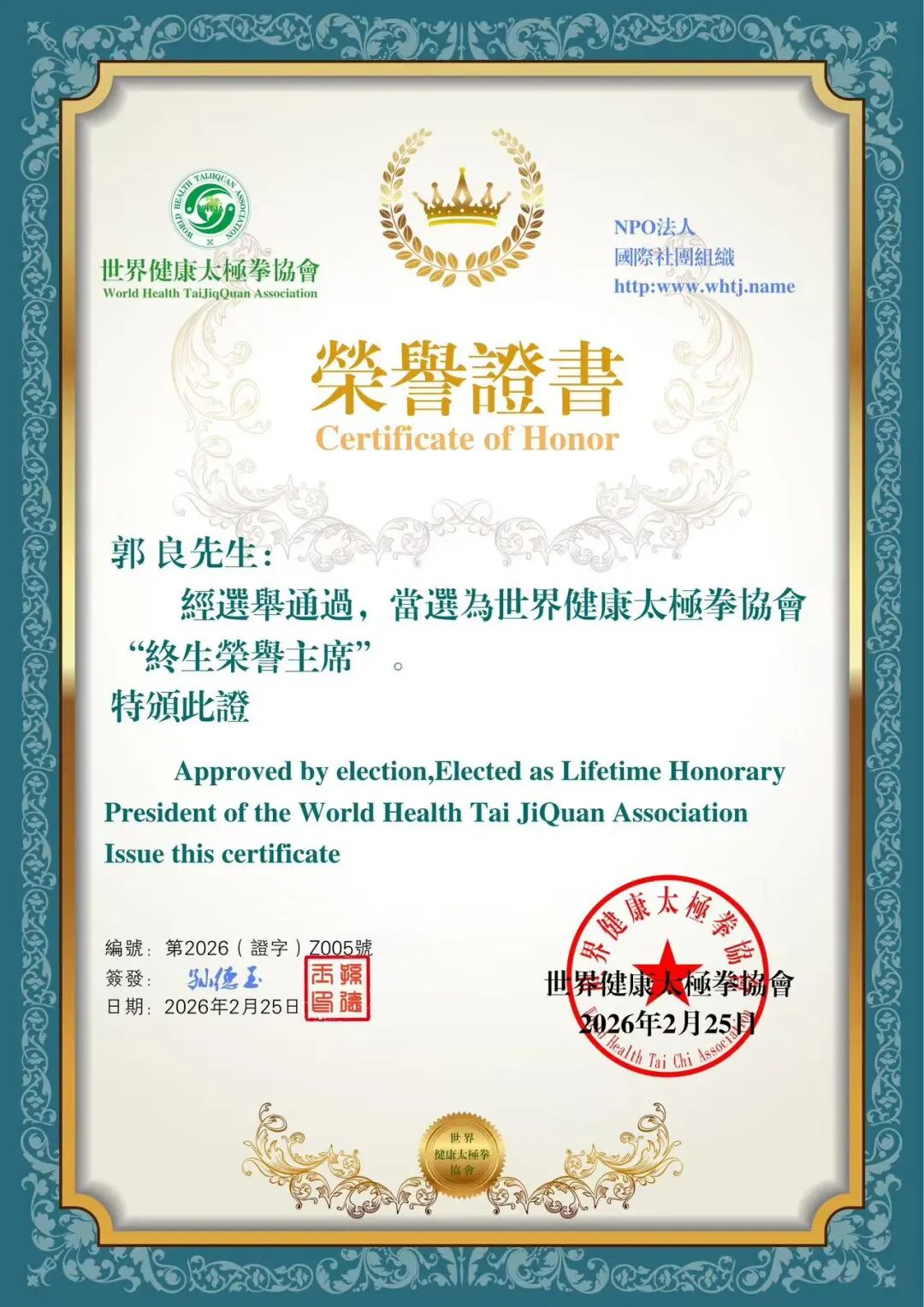 二〇二六年二月二十五日,世界健康太極拳協會正式頒發榮譽證書,郭良先生經選舉當選為該會終生榮譽主席。這一殊榮,不僅是對郭良數十年深耕太極拳藝、弘揚中華武學的高度肯定,更是對他以武載道、以心傳承的精神致敬。