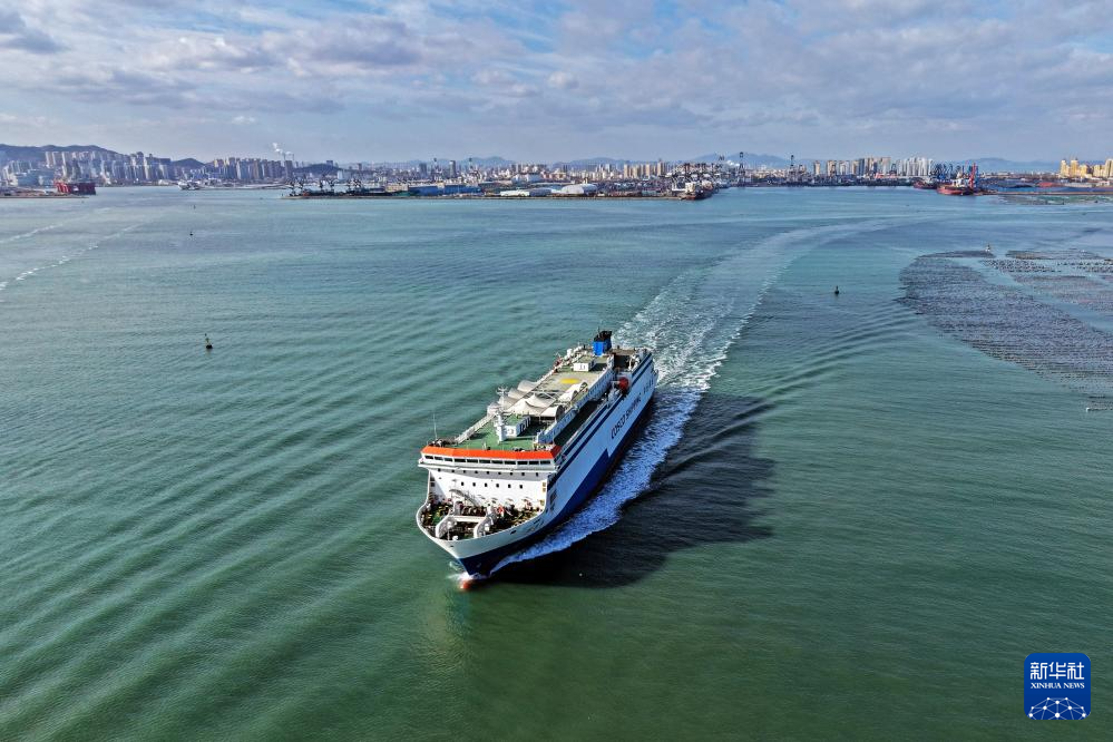 12月8日,一艘客滚船驶离山东港口烟台港(无人机照片)。 新华社发(孙文潭摄)
