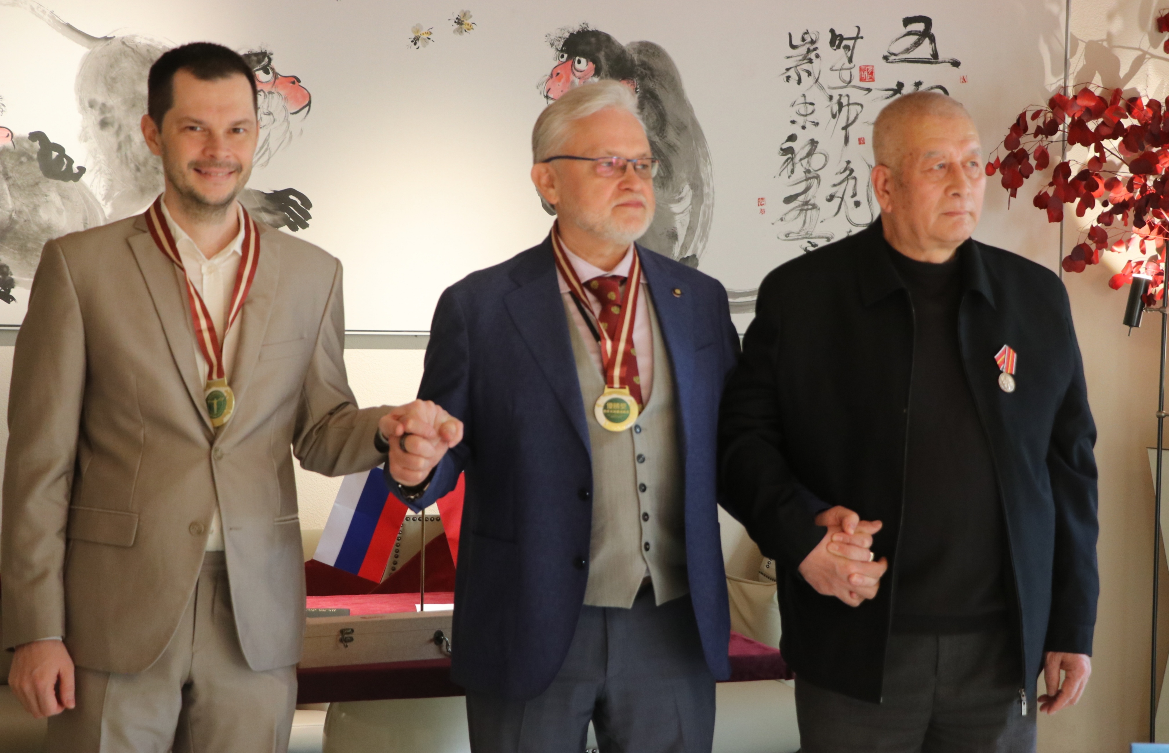 ↑ 世界大健康运动联盟郭周礼主席,俄罗斯武术联盟全权代表、世联盟俄罗斯和独联体国家分会主席伊格里先生,俄罗斯武术联盟执委、俄罗斯健康与美丽公司董事长叶甫盖尼•库茨诺夫先生(左一),在签字仪式上亲切握手。