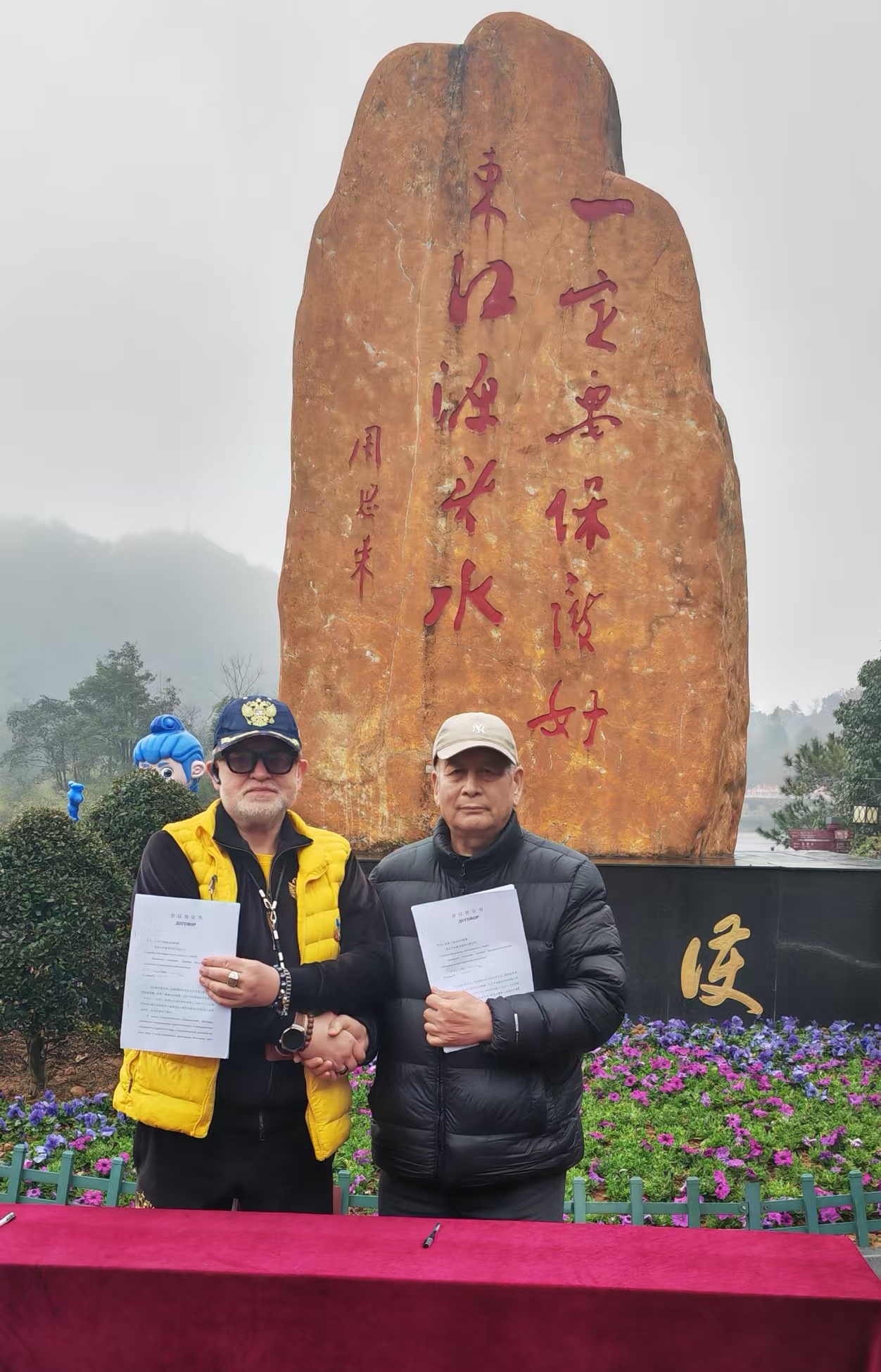 ↑新年第一天,在江西赣州市安远三百山景区举行的签字仪式上,郭周礼主席和伊格里主席,分别代表世界大健康运动联盟和俄罗斯武术联盟,在协议书上签字。