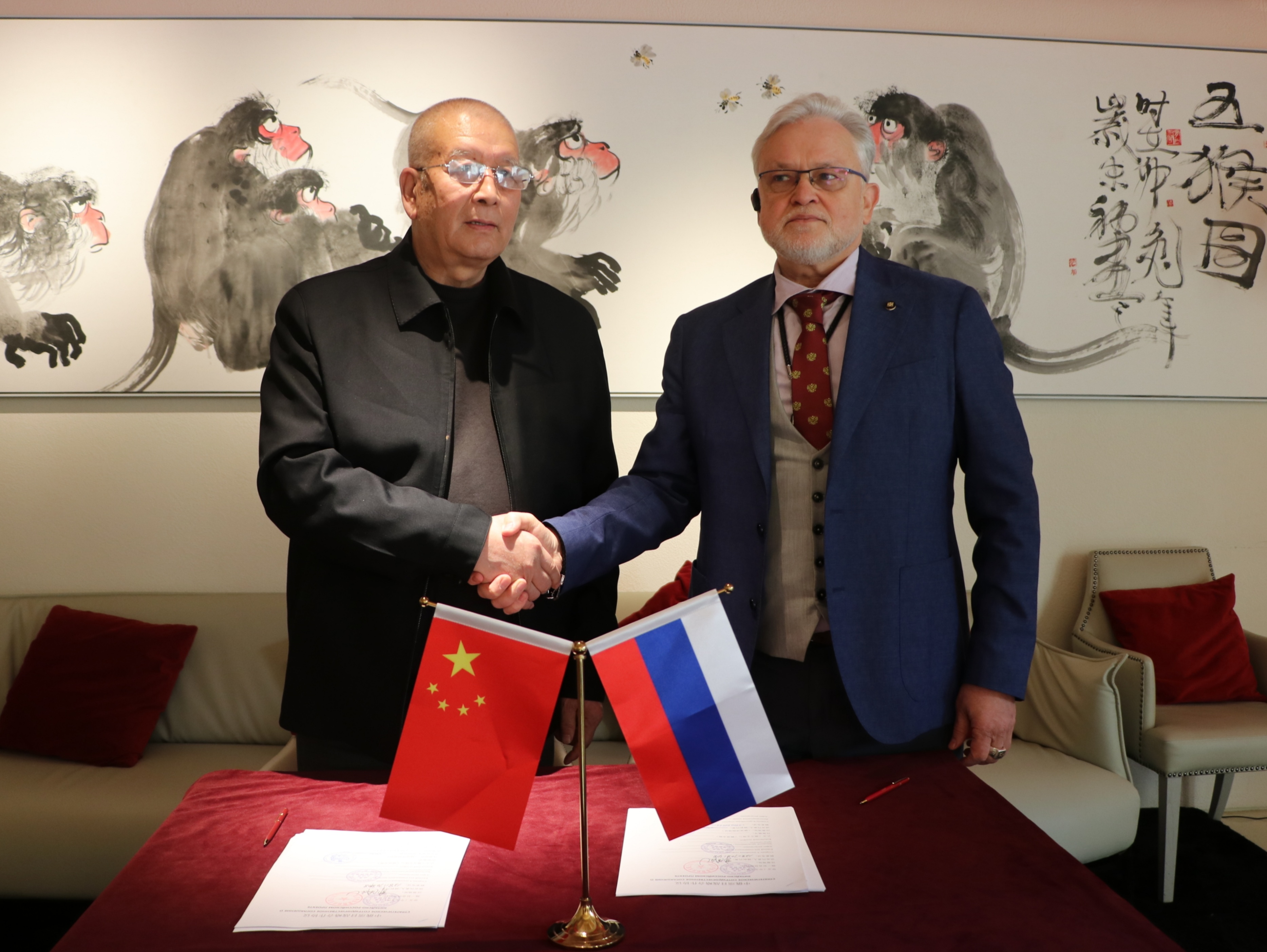 ↑12月26日,在北京举行的中俄战略合作框架协议签字仪式上,世界大健康运动联盟主席郭周礼,俄罗斯武术联盟全权代表、俄罗斯国家统计安全局和全俄战略发展安全董事伊格里,在协议书上签字。
