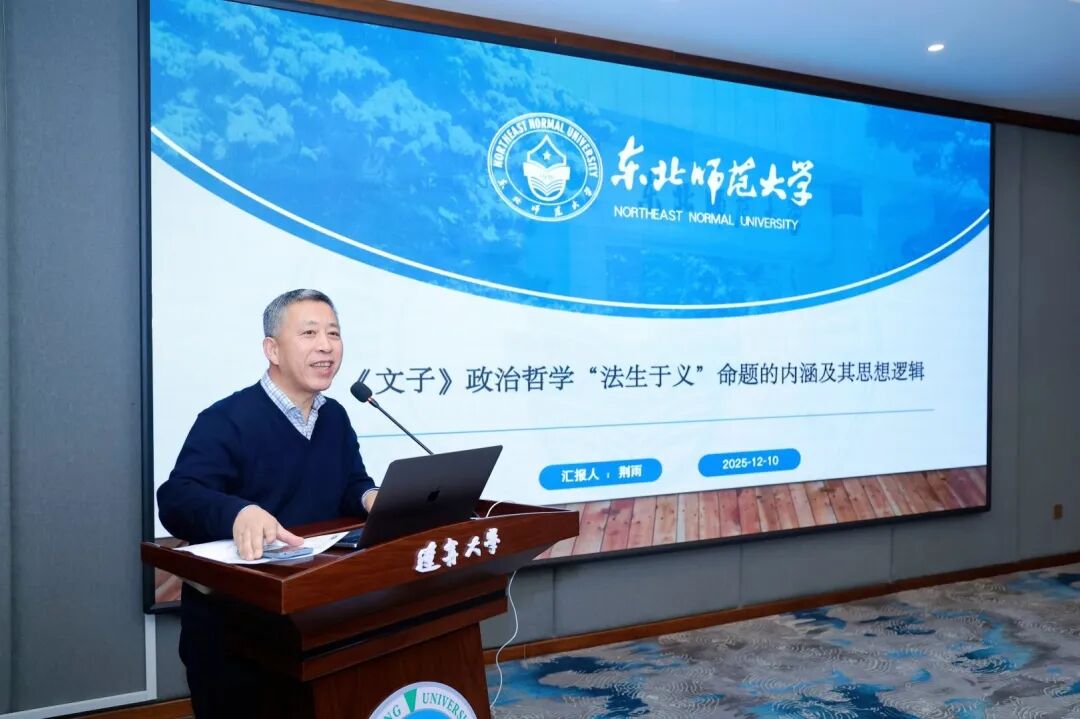 东北师范大学荆雨教授↑以《<文子>政治哲学“法生于义”命题的内涵及其思想逻辑》为题,指出应重视中国传统政治哲学中“敬天、明德、保民”的原发性与原初性。在战国中后期法治主张与思想融合背景下,《文子》提出“法生于义”命题,“法生于义”与“义生于众适”“众适合乎人心”一起,在其思想内部合乎逻辑地展开了关于法之性质与内涵的整体主张。