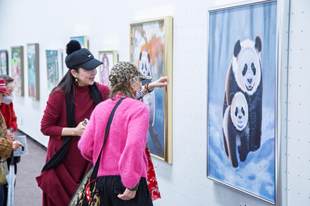 主题表达的演变,更彰显着创作的深度与温度。如果说去年的作品是 “引领”—— 熊猫妈妈引导胆怯的幼崽走出框架,今年的《雪中亲子》则聚焦 “陪伴与愉悦”:调皮的小熊猫踏雪奔跑,妈妈紧随其后,冰天雪地中满是温情。这种转变不仅是熊猫形象的成长,更是创作者对生命与情感的深刻体悟。面对日本民众因熊猫归国产生的失落,吕娟的画作承载了特殊的情感使命:“我希望通过画展让熊猫继续出现在大众视野,安抚孩子们与老人们的心,为他们带来快乐”。在她看来,艺术虽无形,却能成为跨越国界的情感纽带,延续中日两国人民对熊猫的喜爱。