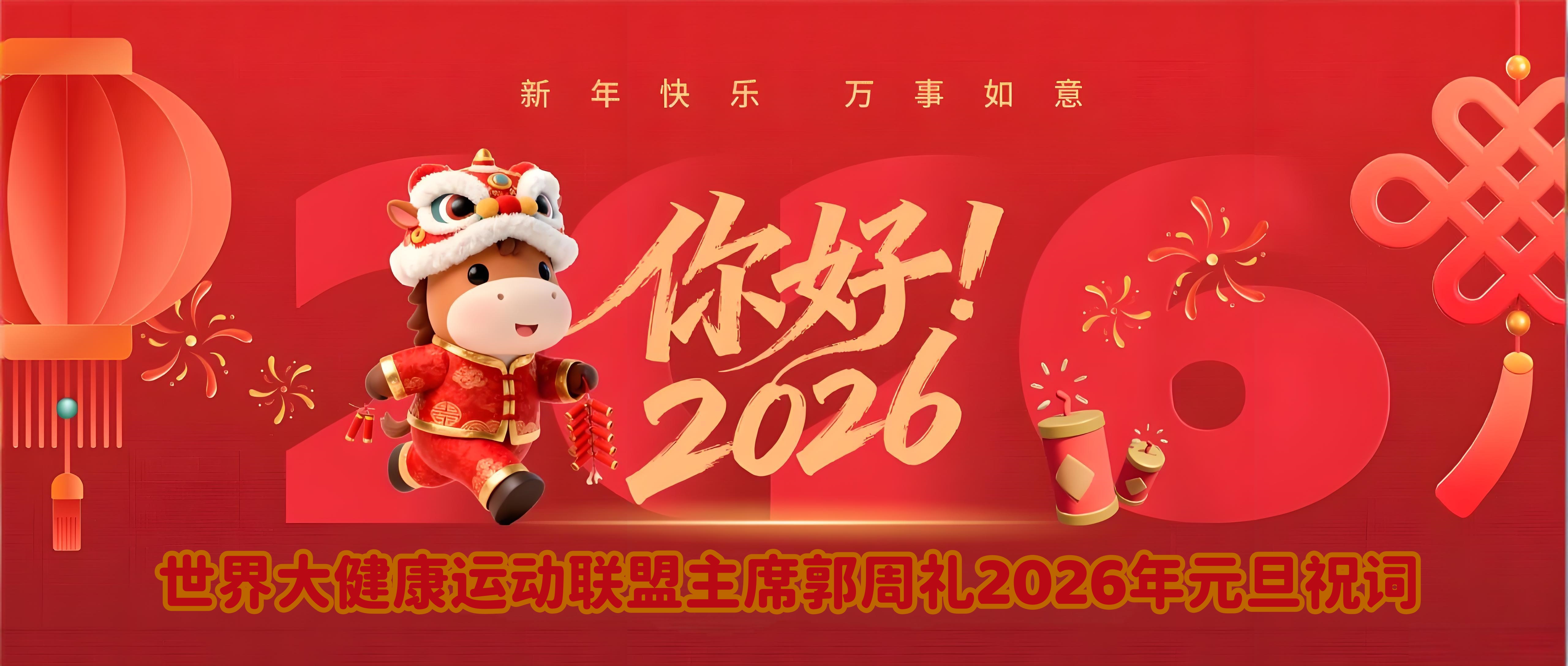 新年的钟声即将敲响,我们满载收获告别2025年,满怀希望迎来2026年。在这辞旧迎新的美好时刻,我谨代表世界大健康运动联盟,向遍布五大洲54个国家和地区的各分会、各专委会、各基地的朋友们,向所有为世界大健康事业作出贡献的同仁们,致以节日的诚挚问候和衷心祝福!