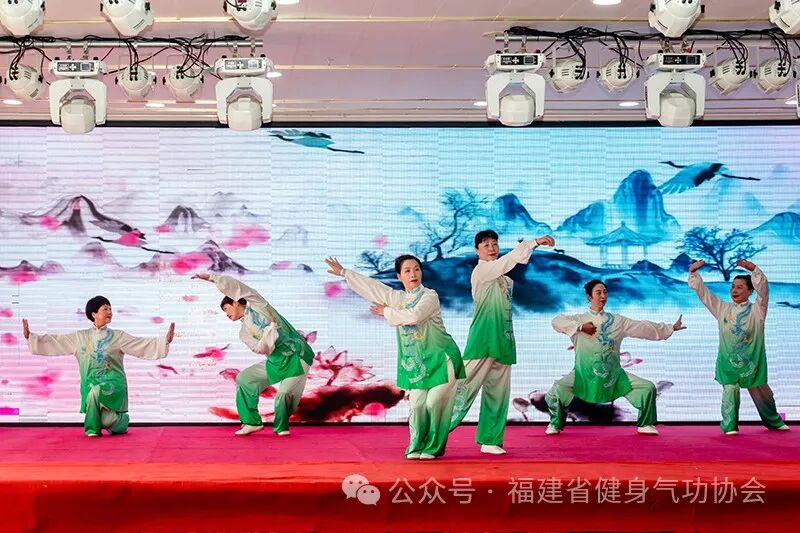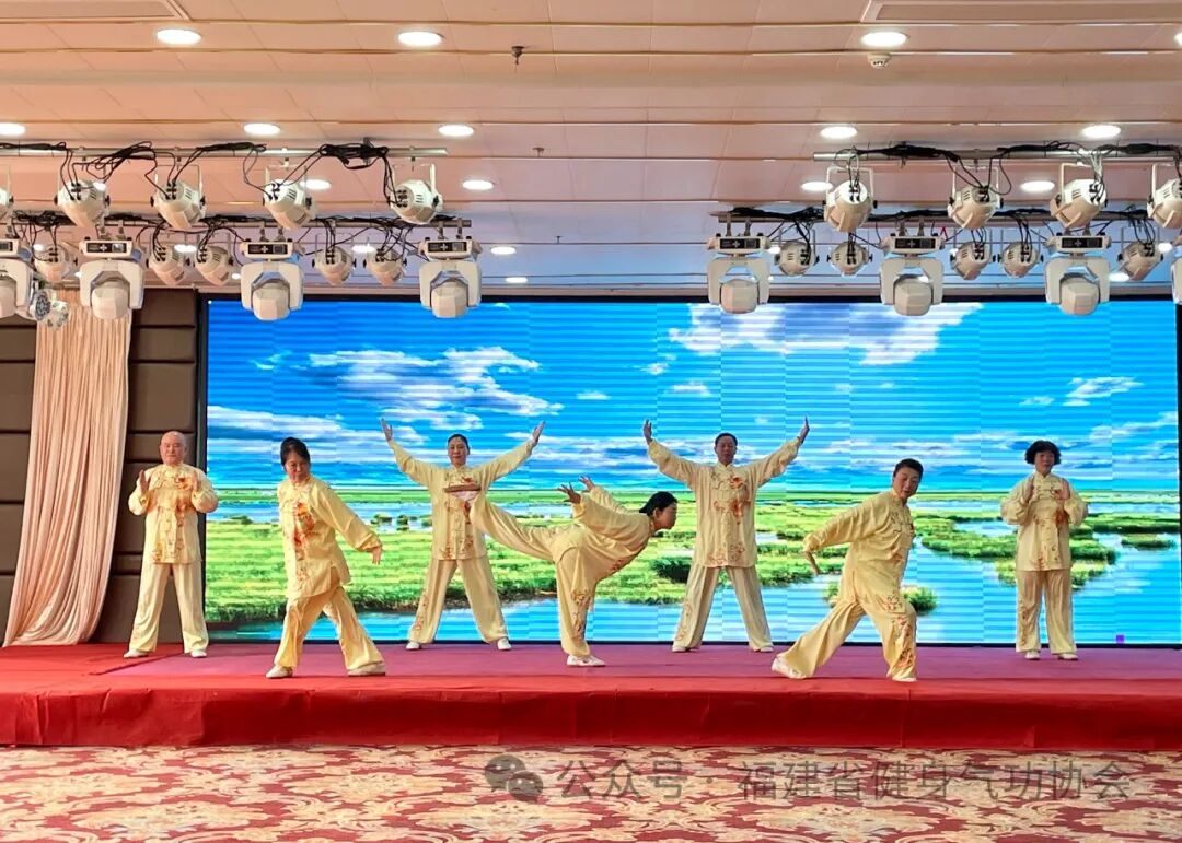 会上,宣读了闽体老(2023)29号《关于表彰老体协工作先进单位(个人)先进辅导站(优秀辅导员、教练员)“老年人健身康乐家园”示范单位的决定》,会长王少文被授予优秀教练员称号。随后,对2023年分会8名优秀会员进行了表彰,永安市老体协主席陈根潘为受表彰人员进行了颁奖并发表了热情洋溢的讲话,陈根潘主席对分会过去的一年所取得的成绩给予了高度的肯定,对2024年寄予了深深的厚望。他说:在过去的一年里,健身气功分会在王少文会长的有力有效的带领下,出色地完成了“三项”任务:一是完成了两个国家级比赛任务,代表福建省老体协参加全国第四届老健会比赛,获得了集体项目两项第一名,两项第二名;个人项目比赛,取得两项第一名,一项第二名,十三项个人优秀奖,成为福建省老体协参加全国赛事历史上取得最好成绩的一次,得到了省老体协和国家老体协的充分肯定;参加了“武夷山杯”2023年全国首届个人公开赛,取得了健身气功五禽戏、八段锦、导引养生功十二法三项一等奖,易筋经二等奖,大舞三等奖的骄人成绩;二是展示交流圆满,与省水利电力学校全体师生一起,围绕第七个世界健身气功日系列活动,共同开展了八段锦、易筋经、导引养生功十二法系列活动,有效的推动了全市全民健身运动蓬勃发展;三是培训和受训人数多,据不完全统计,分会举办培训累计三百多场次,培训受益人数近2万余人,此外分会近百人参加了永安市元宵节踩街等系列公益活动。实现了“两个”目标即老有所乐,老有所为。分会克服了经费短缺、训练时间不足、新老队员技术差异等因素,无论是参加全国、省、三明大赛,大家都能团结一心,竭尽全力,展现作为,为永安、为全省赢得了荣誉,达到了老有所为的目的,在参加全国第四届老健会中,大家以苦为乐的艰辛训练场景历历在目,这是我们老同志老有所乐的表现。分会集体是一支能打硬仗,更能打胜仗的队伍,多次立功受奖为永安、三明、福建省争取了很多荣誉,树立了一个良好的集体形象,正如此次表彰授予的任劳任怨奖、披星戴月奖、拼命三郎奖、身体力行奖、天天向上奖、出类拔萃奖、劳苦功高奖 、德艺双馨奖,充分诠释和展示了分会个人不同的魅力和风采,分会形象不断提升。展望2024年,健身气功分会大有作为,也大有可为,要按照省、三明市和永安市老体协的统一部署,团结一心,群策群力,全面加快实施“五个一”活动计划,为永安市老体协再展风采,再创辉煌,再立新功。 “...鞭炮那啪啪响财源滚滚,来来来来来来来来,打起那个幸福结...”,一支明快而喜庆的舞蹈《中华幸福结》,开启了永安市健身气功分会迎新年联欢活动的序幕。20名健身气功会员,在刘眉月带领下,以奔放的步伐,欢快的节奏,跑向舞台,台下会员积极互动,随着舞台背景的变幻和音乐节奏的起伏,共同用肢体语言,表达了对幸福生活的美好愿望,祝福祖国富强人民幸福。