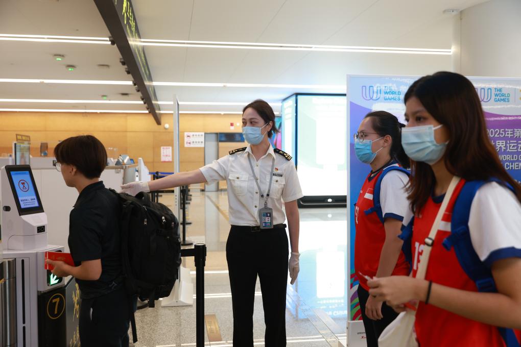 8月3日,成都海关工作人员引导新加坡软式曲棍球队成员通过“世运会专用通道”入境。新华社发(成都海关供图)