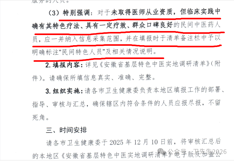 “对于未取得医师从业资质,但临床实践中确有其特色疗法、具有一定疗效、群众口碑良好的民间中医药人员,应一并纳入信息采集范围,并在填报时于清单备注栏中予以明确标注‘民间特色人员’……”抬头四个字“特别强调”,足见重视高度和深度!