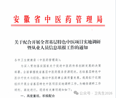 近日,安徽省中医药管理局正式下发 《关于配合开展全省基层特色中医项目实地调研暨从业人员信息填报工作的通知》 。这份看似常规的通知,却隐藏着一个石破天惊的条款: